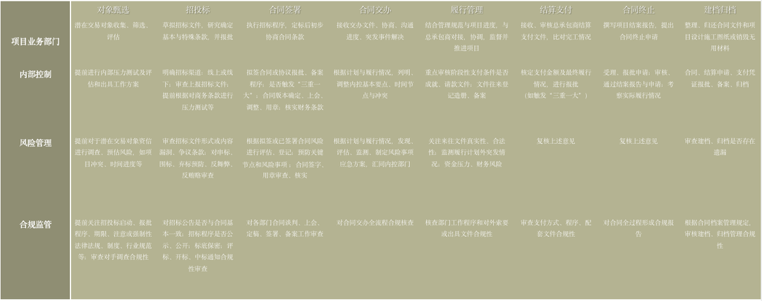 对此,为方便理解,本文以大型基建项目总承包工程分工为例,制定如上表格(见表格3-2),厘清风险管理、内部控制及合规监管关系及负责领域,进而实现有机融合与配合。