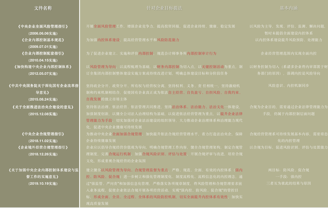 自2006年6月,国务院国有资产监督管理委员会(简称“国资委”)出台《中央企业全面风险管理指引》后,三者频繁出现在中共中央、中央政府及相关部门所发布的规章或规范性文件中,拟对央企、国企或中大型民营企业运营管理进行顶层设计。