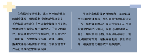 北京电控建立定期(每年)风险识别工作机制。明确针对外部环境变化,各部门应及时做好预判,主动作为,研究应对措施;建立风险识别定期回顾机制,关注风险的可转化性,研判风险的转化趋势,提前应对;对风险进行分类、分级,分别从公司层面、业务活动层面动态识别各种风险,针对性制定控制措施;法律合规部负责提供风险识别的工具方法,负责开展风险识别培训与指导。